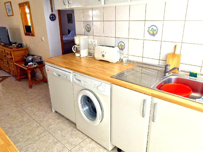Die ehemalige überdachte Terrasse - Haustyp "Rosa" - wurde in den Wohn-/Essbereich integriert, angrenzend befindet sich die offene Einbauküche mit zusätzlichem Ausgang zur hinteren Terrasse. Die Küche verfügt über Spül- und Waschmaschine, Herd mit Ceranfeld, Kühlschrank.