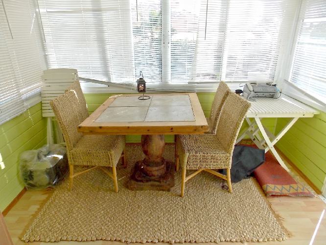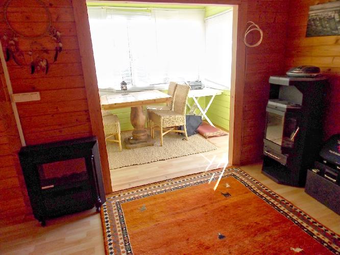 Vinterhage med tilstøtende åpen terrasse, gang, kjøkken, spisestue, stor stue med peis og vifte (ved som brensel), første soverom med eget badekar, andre soverom med tilstøtende dusjrom og bidet, og det tredje soverommet. Alle soverom har innebygde garderober.