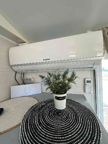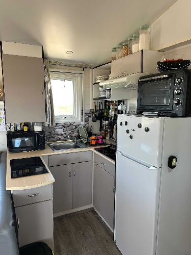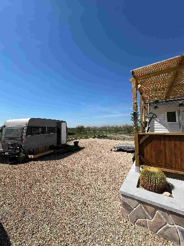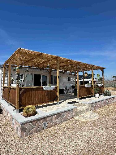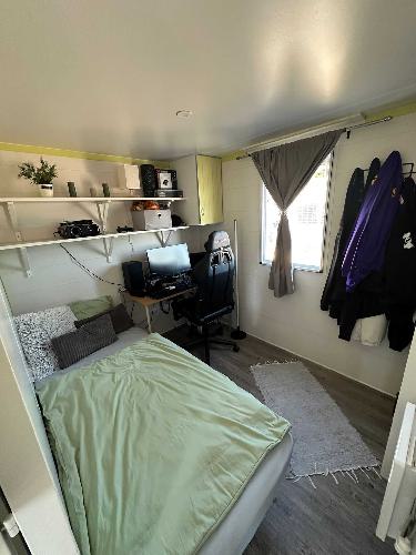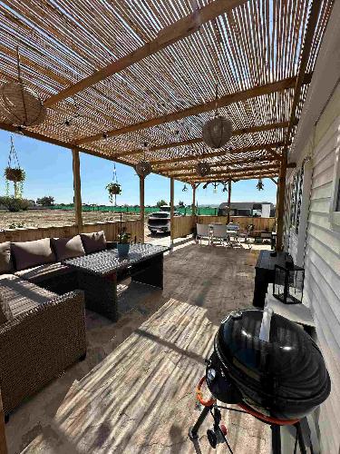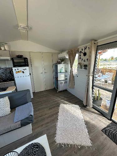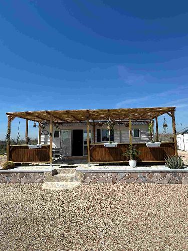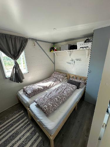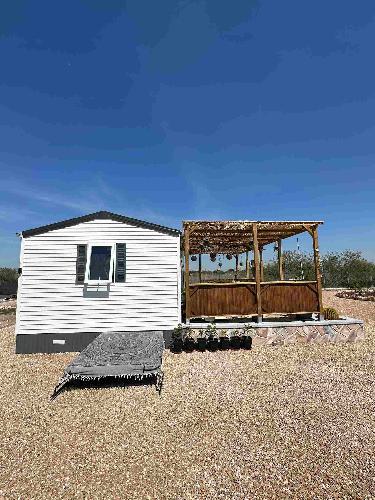 En pent møblert campingvogn for gjester er plassert ved siden av mobilboligen.