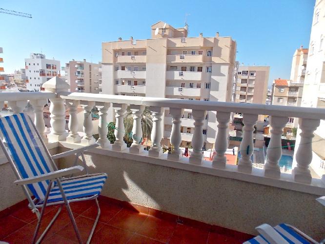 Appartement à Torrevieja avec piscine communautaire devant la maison - à louer à long terme, loyer mensuel 550 €, commission unique 550 €, caution 550 €.Les frais supplémentaires (électricité / eau) sont à la charge du locataire.L'appartement est meublé et équipé, dispose d'un salon, 2 chambres avec placards, cuisine américaine, débarras, salle de bain avec baignoire et bidet.Adjacent au salon est un balcon (env. 4 m²), terrasse sur le toit avec vue sur la mer. Dans le salon il y a un système de climatisation / chauffage et ventilateur de plafond, chauffage électrique dans une chambre.L'appartement est au 4ème étage avec ascenseur.Restaurants, bars, magasins (y compris les supermarchés allemands) sont accessibles en quelques minutes à pied, l'une des différentes plages est à environ 6-8 minutes en voiture ou environ 20 minutes à pied. L'aéroport d'Alicante est à 40-45 minutes en voiture.
